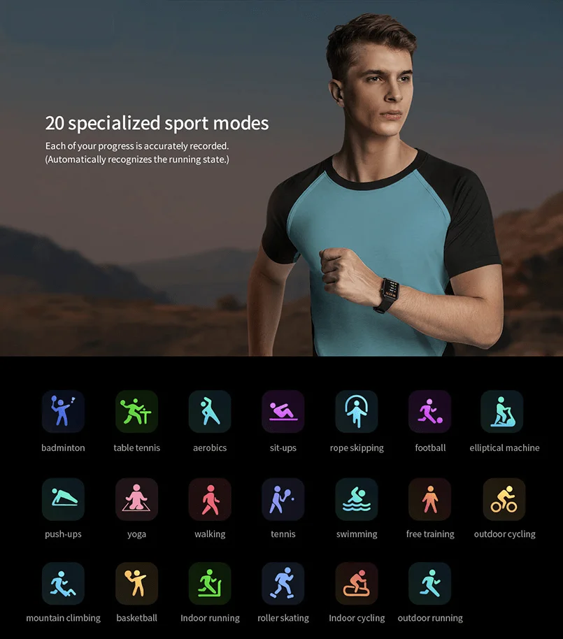 Đồng hồ thông minh Mibro T1 hỗ trợ người dùng tới 20 môn thể thao như: chơi cầu lông, bơi lội, chống đẩy, bóng đá, đi bộ, bóng chuyền,… và một số môn tập luyện đa dạng khác.